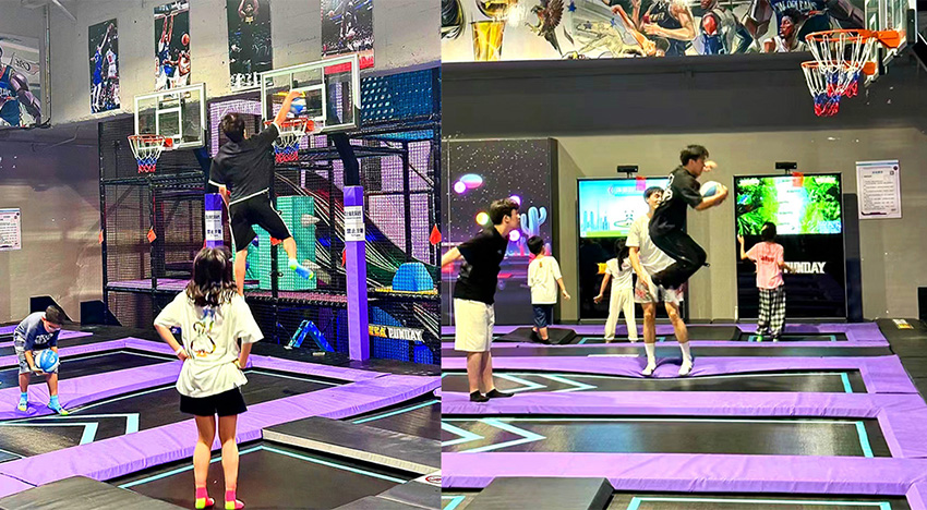 蹦床競技區是集自由蹦床、海綿池、拍拍樂、蹦床灌籃等于一體的綜合運動區域。可以體驗一把扣籃的感覺和海綿池斗智斗勇的對決!也可以進行各種團建活動。