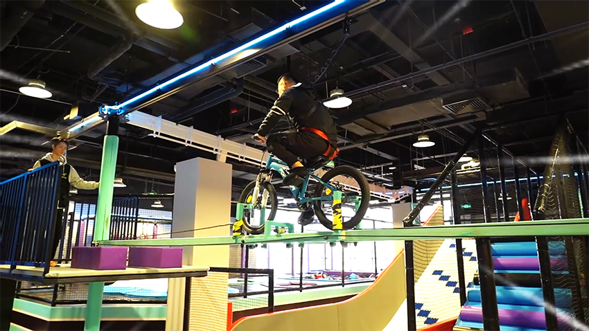 特制的衣服,通過蹦床的彈力,可以粘貼在覆蓋有魔術貼的墻壁上,從而實現“飛檐走壁”的體驗效果。