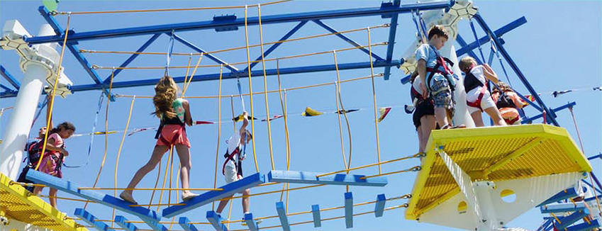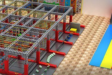 拓展支架:整體可拆裝、可移動,無現(xiàn)場焊接,鋼架體全部法蘭連接,設有2層斜梯,器材在整體上有足夠的強度,無明顯的擺動、永久變形及損壞現(xiàn)象,項目承載用鋼絲繩全部采用丙綸外層鋼絲繩,此繩具有鋼絲繩的安全強度還具有游樂器材的安全防護標準,采用當今世界最先進的鋼絲繩壓制金屬接頭工藝連接和靜音軌道,多向通行,增大載客量。