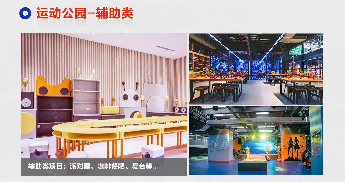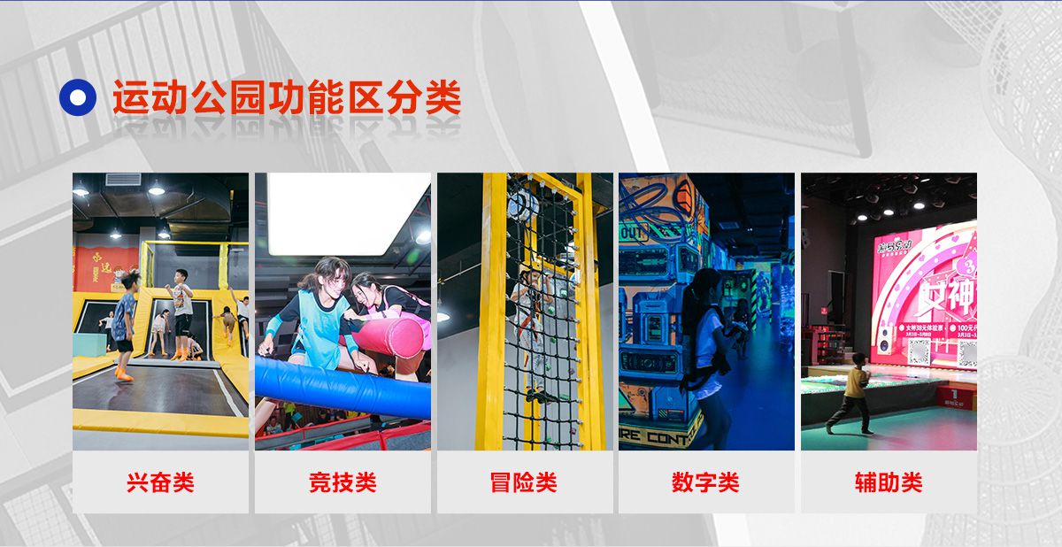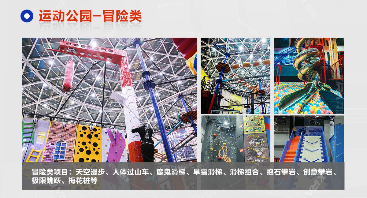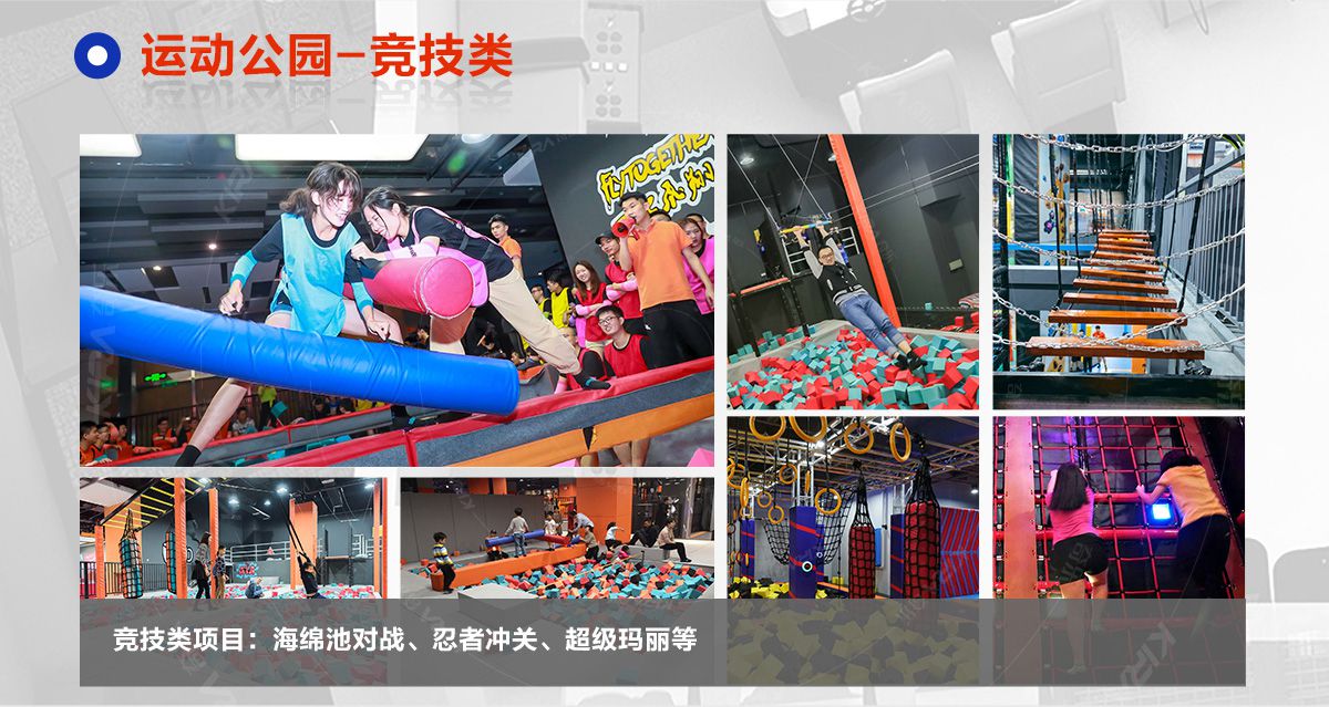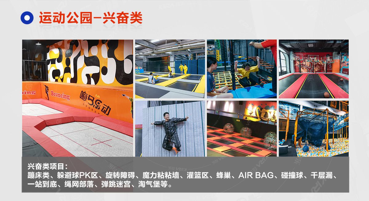 超級運動公園源自美國,以業態分布劃分,可分為成人娛樂版塊、兒童娛樂版塊、潮流科技及輔助配套四大功能版塊;以運動程度劃分,可分為基本區、興奮區、冒險區、數字科技區、輔助區。適合全年齡段玩家參與娛樂,打破年齡、性別、愛好等限制,為大眾呈現一幅“快樂運動 有氧生活”的精彩運動娛樂公園。 高格調與國際接軌的優質項目,引領玩家突破常規的運動局限,體驗全新的運動嘉年華:自由蹦床區、跑酷區、躲避球PK區、灌籃區、AIR BAG跳躍區、粘粘墻、背摔臺、奧運蹦床區、海綿坑、忍者沖關、飛狐塔、滑索、彈跳迷宮、魔鬼滑梯、旱雪滑梯、拓展攀爬、創意攀巖、抱石攀巖、極限跳躍、天空漫步、梅花樁、冒險塔、科技互動類等三十余種項目。