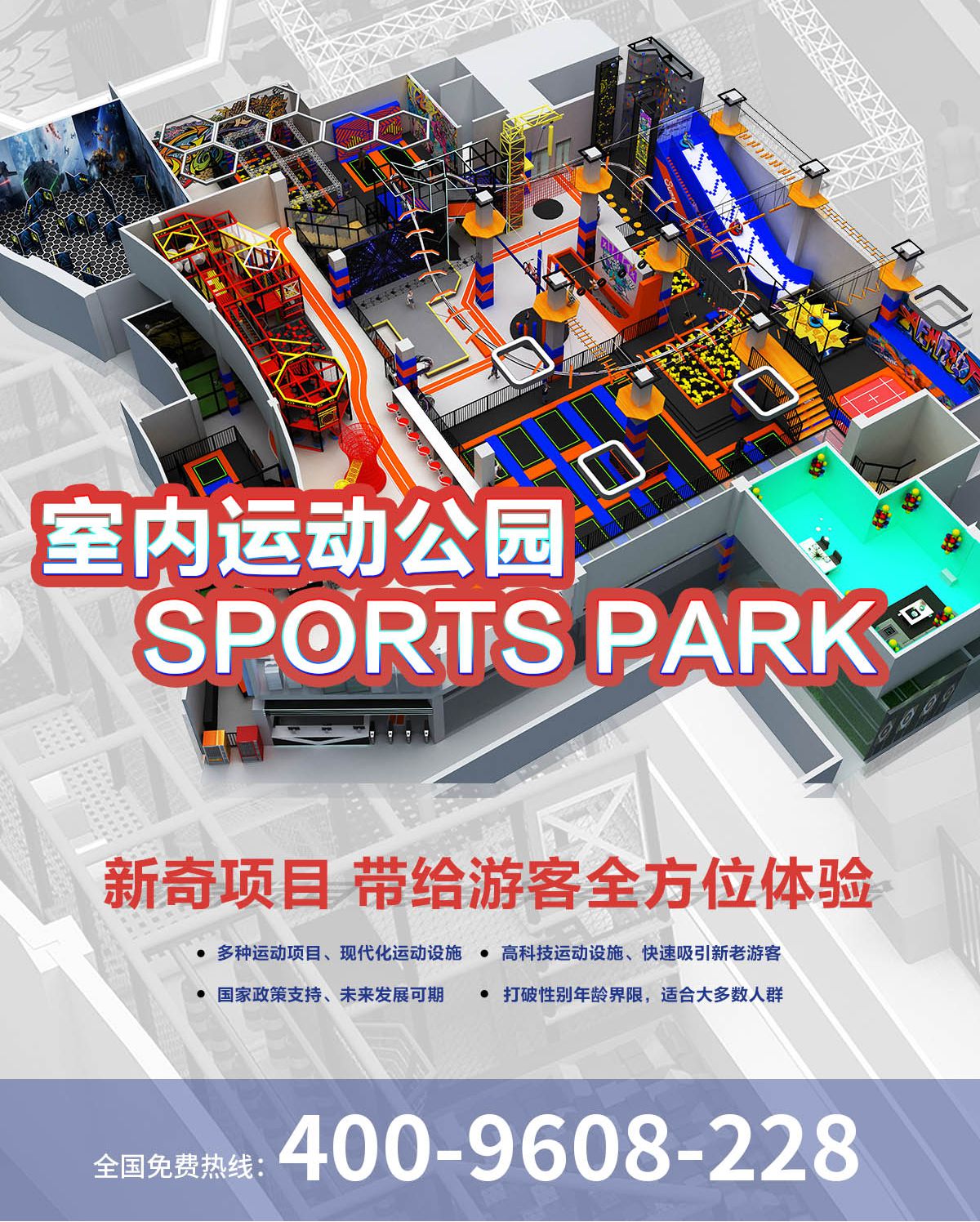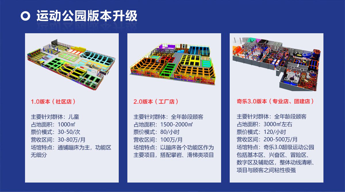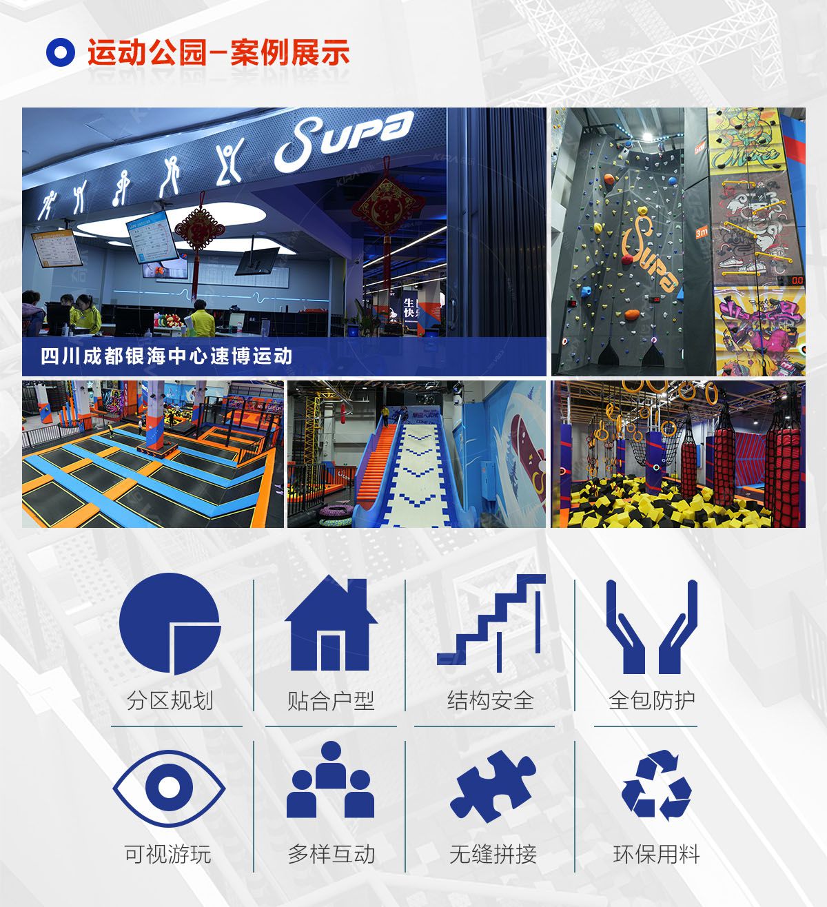 超級運動公園源自美國,以業態分布劃分,可分為成人娛樂版塊、兒童娛樂版塊、潮流科技及輔助配套四大功能版塊;以運動程度劃分,可分為基本區、興奮區、冒險區、數字科技區、輔助區。適合全年齡段玩家參與娛樂,打破年齡、性別、愛好等限制,為大眾呈現一幅“快樂運動 有氧生活”的精彩運動娛樂公園。 高格調與國際接軌的優質項目,引領玩家突破常規的運動局限,體驗全新的運動嘉年華:自由蹦床區、跑酷區、躲避球PK區、灌籃區、AIR BAG跳躍區、粘粘墻、背摔臺、奧運蹦床區、海綿坑、忍者沖關、飛狐塔、滑索、彈跳迷宮、魔鬼滑梯、旱雪滑梯、拓展攀爬、創意攀巖、抱石攀巖、極限跳躍、天空漫步、梅花樁、冒險塔、科技互動類等三十余種項目。
